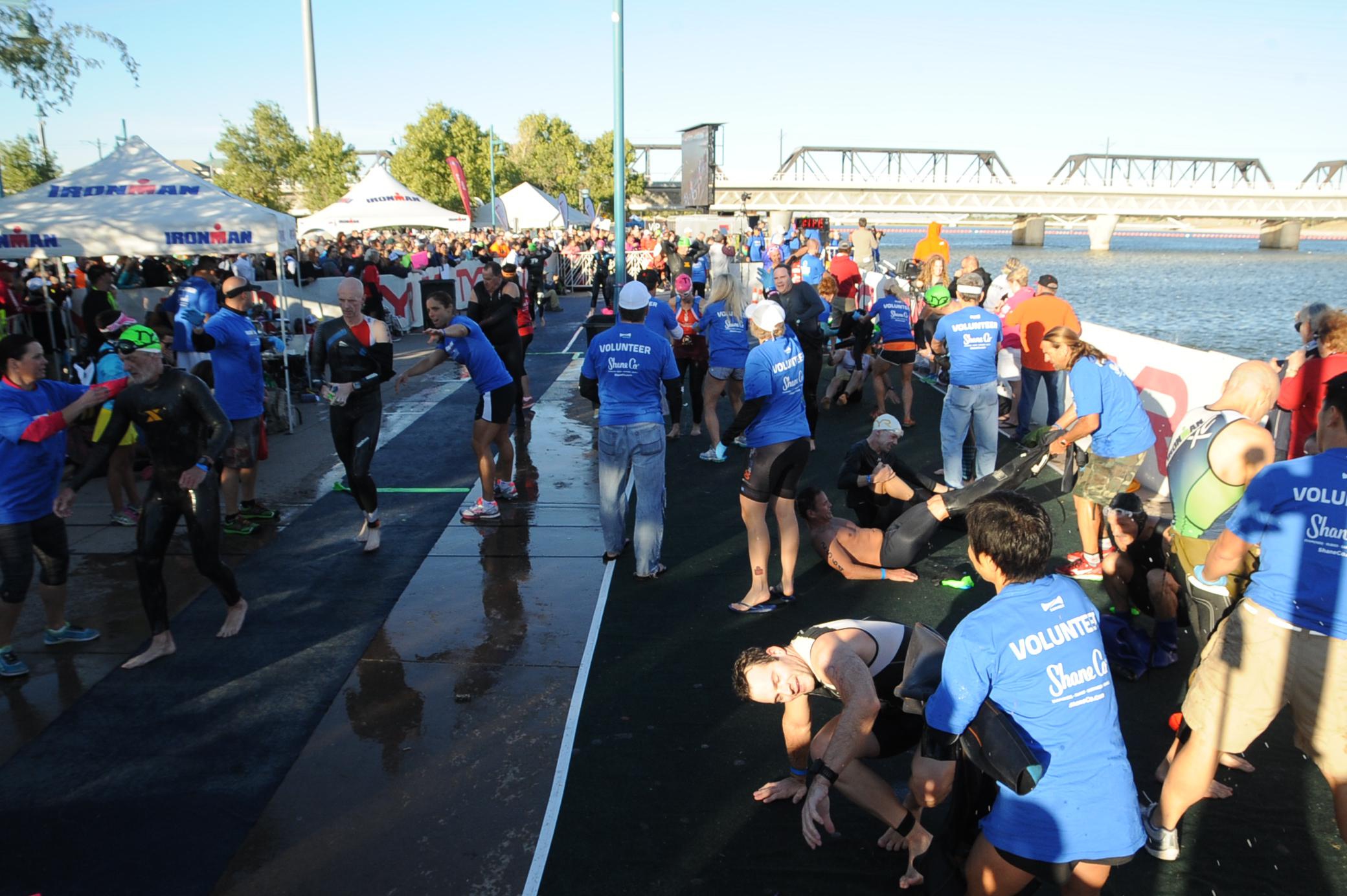 Как я написал выше, американские гонки суперские. Суперские прежде всего уровнем сервиса волонтеров. Из воды тебя выдергивают как редиску. Пакеты на Т1 и Т2 тебе выдают, можно за ними не бегать. В палатке на Т1 и Т2 к тебе тут же подскакивает волонтер, который делает все, чтобы ускорить тебе транзитку – вытряхивает вещи, ненужное снаряжение засовывает в пакет и сам пакет забирает. Велик у тебя в Т2 забирают, не надо с ним носиться. Если повезет, то в Т1 велик тебе выкатывают. А на финише, помимо того, что тебя объявляет сам Марк Рейли, так к тебе тут же прикрепляется волонтер, который ходит с тобой вместе, пока ты не уйдешь из финишной зоны. Он следит, что ты снял чип, попил воды, получил футболку нужного размера, держит твои шмотки, пока ты фоткаешься и вообще всячески поддерживает. Это фантастика!